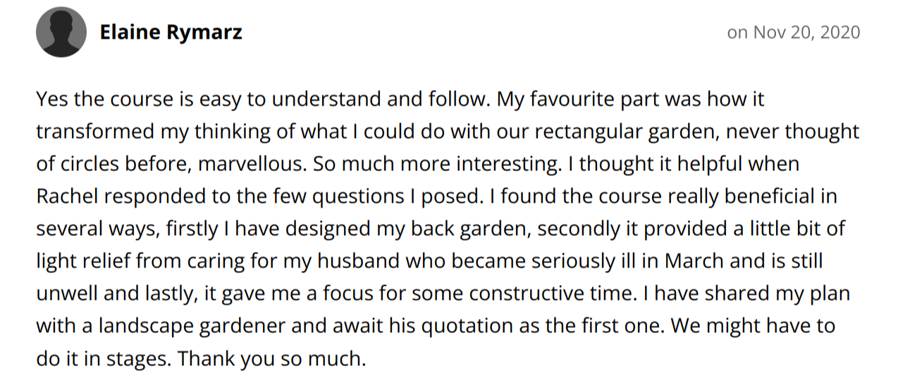 Immediate, lifetime access (contents will be put in a Dropbox folder & emailed in January) to the Survey Formula, the Fast-Track Garden Design Formula and ability to ask Rachel questions in the members' area (though she's rarely needed as the courses are so thorough).